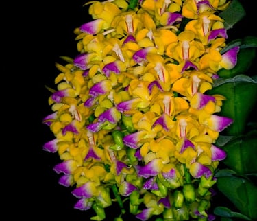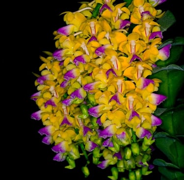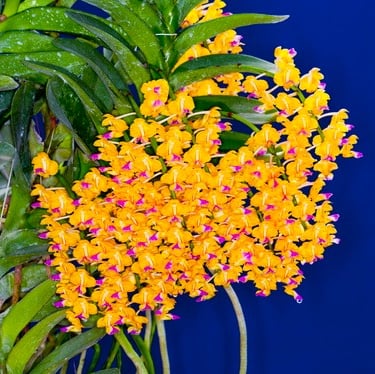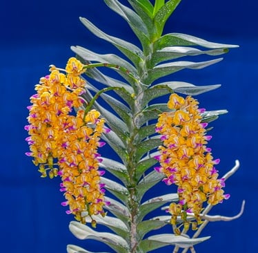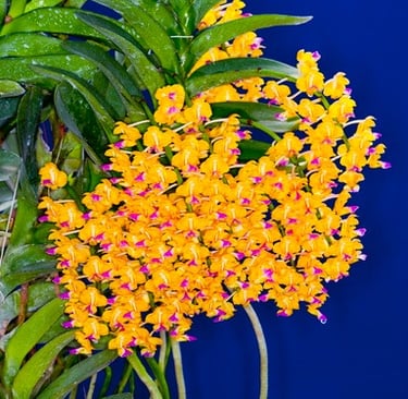In Thai, it is called Aueng-Kularb-Lueng-Korat. Aueng means Orchid. Kularb in Thai means Rose because the former Thai botanist called this genus (Aerides) because of fragrant-smelling like rose. Lueng means Yellow. Korat is the local name of Nakhon Ratchasima province. The name of Korat (Khorat) plateau is also a distribution area for this orchid. This exhibition would like to offer "Aueng-Kularb-Lueng-Korat" to the hearts of all visitors with warmth.