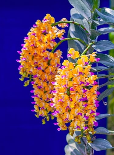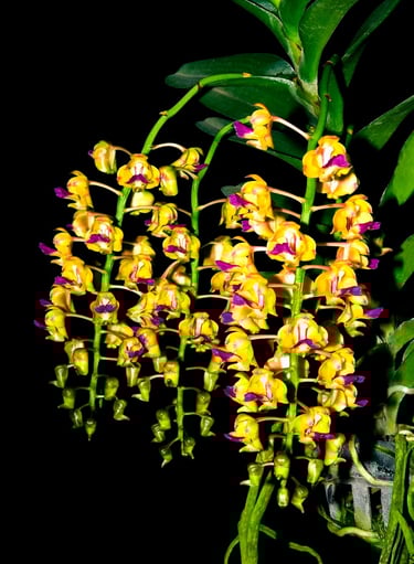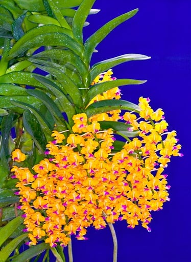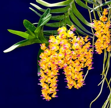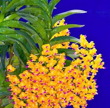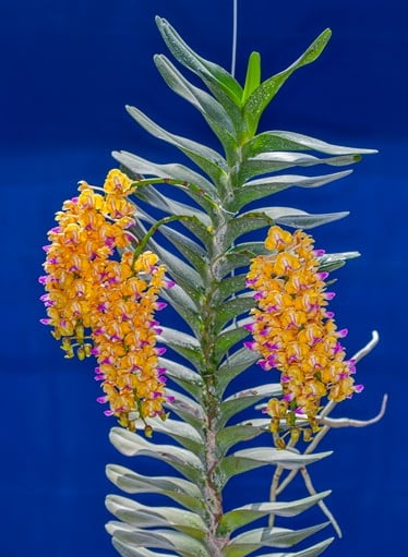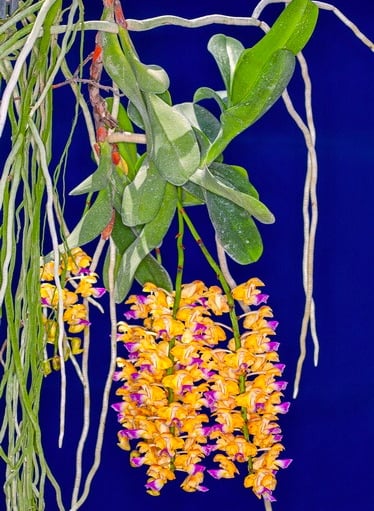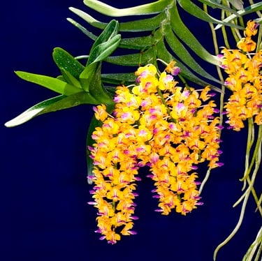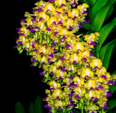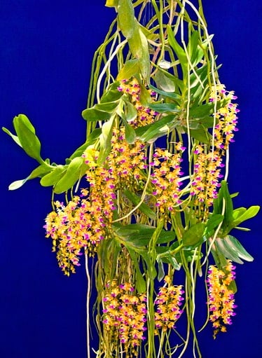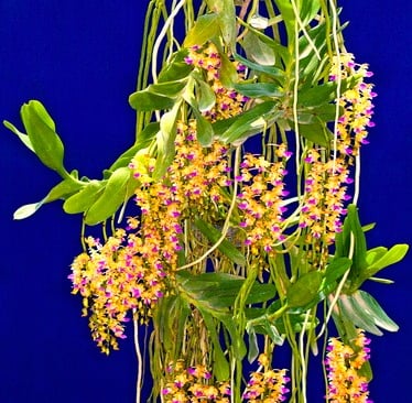 is a Thai orchid. Its origin is from Indochina, mostly Laos and Vietnam. It is noteworthy that the shoots straight up or leaning down. The leaves are thick and hard, bright green, with two unequal indentations at the tip. The leaves are about 3 cm wide and 15 cm long. The roots are aerial (epiphyte). The flowers are in hanging clusters, about 15-30 cm long, with 15-20 flowers per inflorescence. The flower color is yellow, ranging from light yellow-white to yellow-orange. There is a pink-purple color at the tip of the petal, on the back of the flower, and on the lip of the flower. It has a good fragrance. It is found in deciduous forests or dry evergreen forests in Thailand, in the northeastern region, at 200 -1,000 meters above sea level.